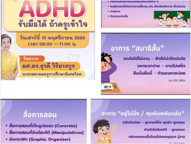 วันเสาร์ที่ 15 พฤศจิกายน พ.ศ. 2568 ครูแผนกอนุบาล ได้เข้าร่วมการอบรมออนไลน์ หัวข้อ “ADHD รับมือได้ถ้าครูเข้าใจ”วิทยากรโดย ผศ.ดร.ยุวดี วิริยางกูร นายกสมาคมครูการศึกษาพิเศษไทย เนื้อหาในการอบรมเป็นเรื่องเกี่ยวกับการสังเกตพฤติกรรมเด็กที่อาจสงสัยว่าอยู่ในกลุ่มเสี่ยง สมาธิสั้น หรือไม่ และการจัดกิจกรรมการเรียนการสอนที่เหมาะสมรวมทั้งสื่อประกอบการสอนที่ช่วยในการพัฒนาเด็กให้สามารถเรียนรู้ได้ ซึ่งทำให้ครูเข้าใจธรรมชาติ ผลกระทบต่อการเรียนรู้ เทคนิคการปรับพฤติกรรมและส่งเสริมศักยภาพเด็กให้มีพัฒนาการที่ดีขึ้น  รายงานโดย นางภัทรานิษฐ์  ชัยอนนต์