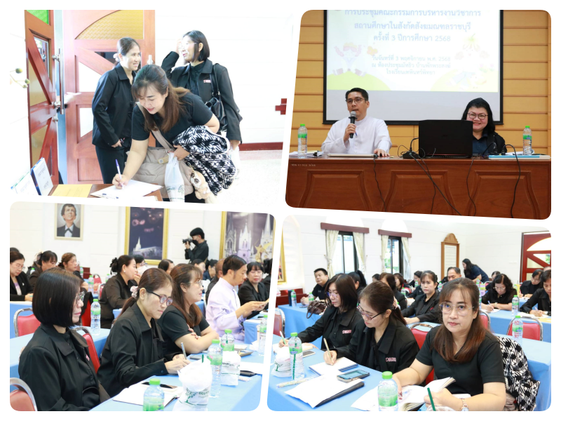 วันจันทร์ที่ 3 พฤศจิกายน 2568 นางอรวรรณ สุกใส นางภัทรานิษฐ์ ชันอนนต์ และนางสาวพรทิพย์  ทองรอดเข้าร่วมการประชุมผู้บริหารและกรรมการบริหารงานวิชาการ สังฆมณฑลราชบุรี ครั้งที่ 3 ปีการศึกษา 2568 ณ ห้องประชุมมัทธิว โรงเรียนเทพินทร์พิทยา อ.บ้านโป่ง จ.ราชบุรี เกี่ยวกับ การดำเนินงานระหว่างศูนย์วิชาการและโรงเรียนในสังกัดสังฆมณฑลราชบุรี การสัมมนาหัวหน้ากลุ่มงานบริหารวิชาการ การจัดงานมหกรรมวิชาการโรงเรียนในสังกัดสังฆมณฑลราชบุรี ประจำปีการศึกษา 2568 รายงานโดย นางสาวพรทิพย์  ทองรอด